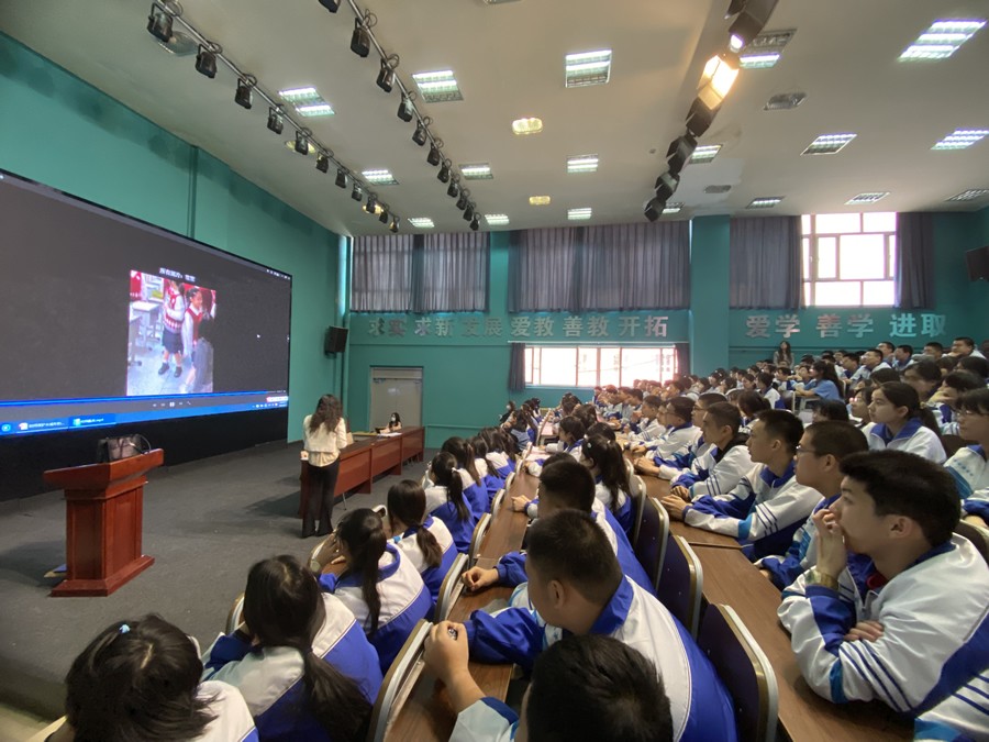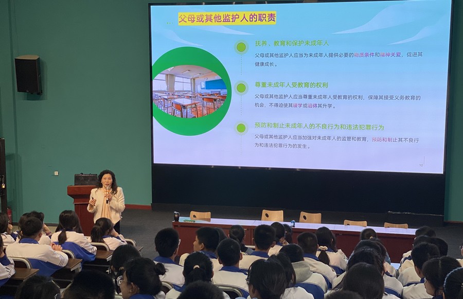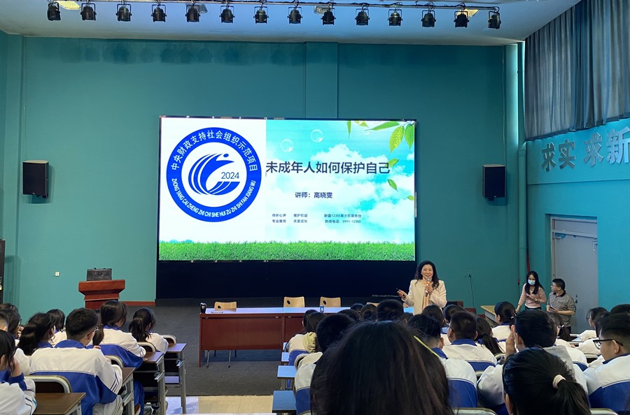 在2024年中央财政支持社会组织参与社会服务项目的“石榴籽行动——新疆各族青少年融情关爱活动” 的推动下,2025年4月9日南湖高级中学迎来了一场别开生面且意义非凡的法治讲座。此次讲座学校特别邀请到了新疆12355青少年服务台心理讲师、新疆心理咨询师协会成员高晓雯老师,为同学们带来了一堂关于“未成年人如何保护自己”的精彩课程。