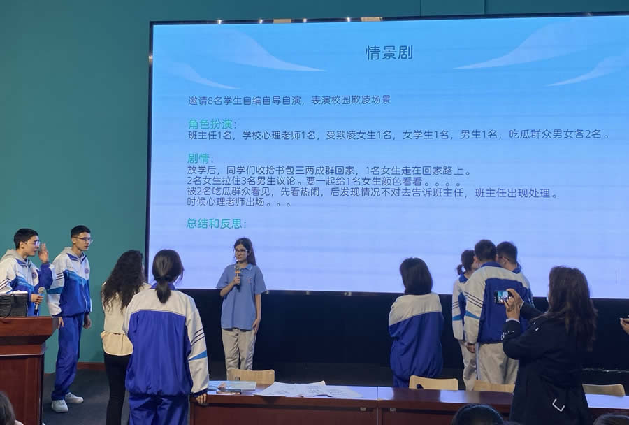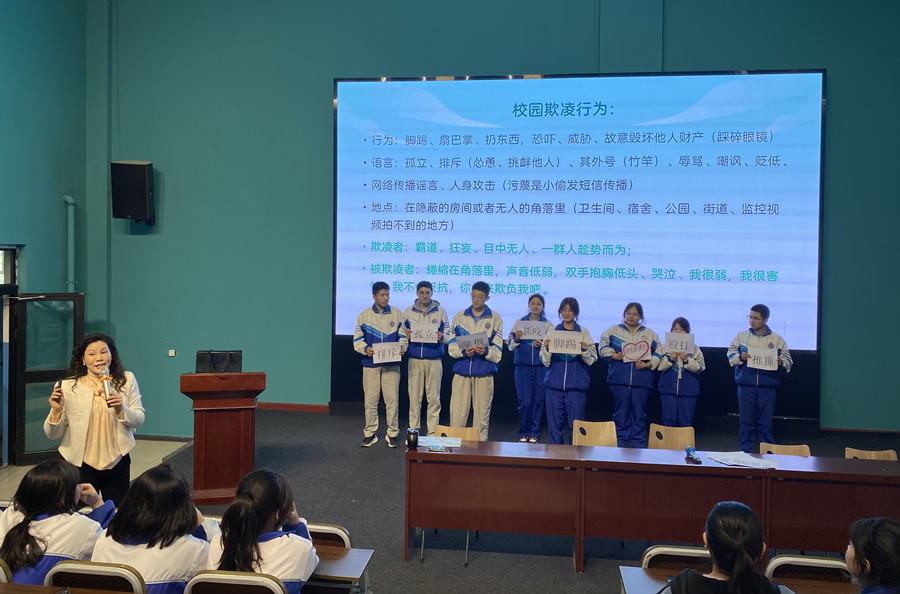 为了让同学们更好地理解应对方法,高老师邀请了 8 名同学自编自导自演校园欺凌场景,生动还原了可能出现的欺凌情况。随后,高老师着重讲解应对策略,让同学们深刻掌握在危险情境下如何保护自己。一幅幅直观的图片、一个个真实发生的案例,将原本抽象的法律条文具象化,让同学们有了更深刻的感受,也让同学们深刻认识到法律在生活中的重要性。